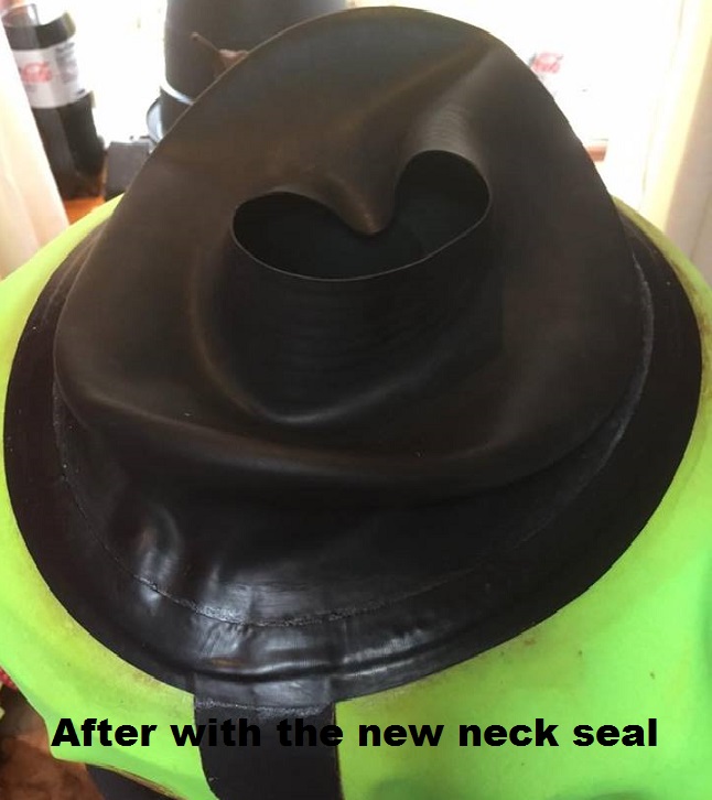 We pride ourselves on getting your suit back to you looking at its best. To that end where at all possible, all old seals and tapes are removed completely and replaced in a way that looks brand new with as many of the old glue marks removed as possible. We also as standard tape both the outside and inside of seals where possible (some neck bibs prevent this). This is not something routinely offered by some other repair centres.
